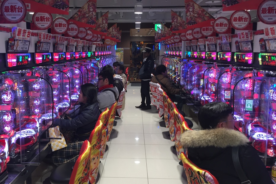 Pachinko is a mechanical game that originated in Japan. It is meant to be a recreational arcade game, but is most frequently used for gambling. The player fires small metal balls into the machine that cascade down through a number of pins and are either captured or put back into play. The object is to collect as many as possible and exchange them for prizes. Loud and smoky pachinko parlors, like this one in the Shinjuku neighborhood of Tokyo, can be found all over the country.