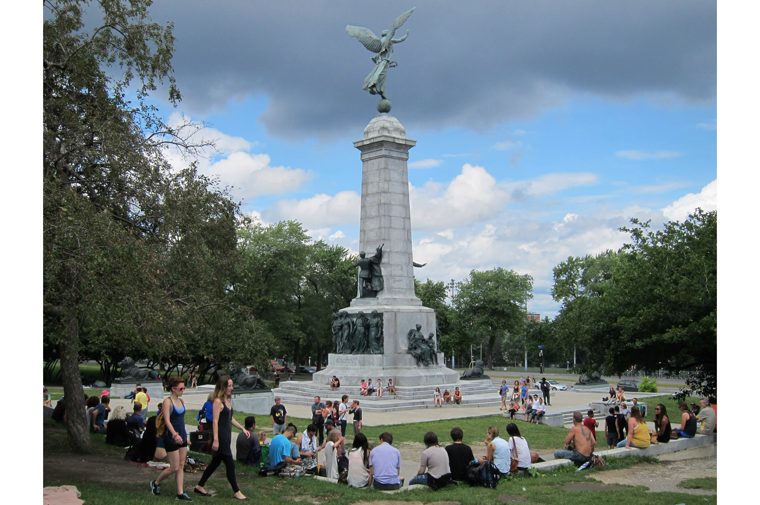 During Sundays in the summertime, the Mount Royal Park in Montreal hosts the Tam-Tams Jam. Located at the George-Étienne Cartier Monument, it is an informal festival attracting a wide variety of drummers, dancers, vendors, and onlookers. The exact details of the festival’s beginnings are subject to debate, but gathering at Mount Royal Park on Sundays has been popular among Montrealers since the park’s inauguration in 1876.